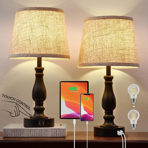2 USB Fast Charging PortsTwo USB ports with a 5V/2.1A output allows you to fast charge your smartphones, tablets, power banks, kindle readers or any other usb powered devices with ease. | High-quality Design Home ImprovementOur dimmbale living room lamp sets designed with made-to-last exquisite linen lampshade, anti-rust metal finishing. We specially add some weight in the lamp base to avoid knocking the lamp off by children or pets. Standard E26 socket matches perfectly with the LED Edison bulb that comes with the package. | Free 2 LED Bulb IncludedFor your convenience, we offered two energy-saving LED bulbs for free, you don't need to buy bulbs separately. The energy-saving E26 LED Bulbs, giving off a stable and soft illumination for your home. 60W 2700K warm white light equivalent bulbs can help you save at least 90% energy bills in the daily. Moreover, no flickering light or buzzing prevents eye fatigue and provides a comfortable,stress-free atmosphere. |